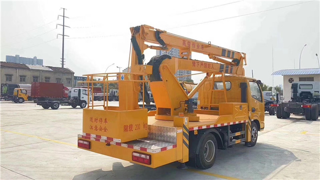 東風多利卡16米高空作業車詳細介紹:底盤配置:底盤型號:EQ1070DJ3BDF ,軸距3308,駕駛室1730雙排底盤,YC4FA115-50,5檔變速箱,輪胎7.00鋼絲胎,電動門窗,中控鎖,ABS,排氣制動,整車外形尺寸:7550*1980*3080,上裝配置:液壓360度全回轉,三節折疊臂,單液壓舉升缸,帶雙向平衡閥,電控操作舉升臂,1噸可伸縮式吊鉤,四支液壓油缸可調式支腿帶雙向液壓鎖(支腿操作為手動操作,可單獨控制)。左右警示燈,黃色車身,全車貼反光標識,雙人穩定作業斗,帶后防護,倆側防護,配一個移動工具箱。